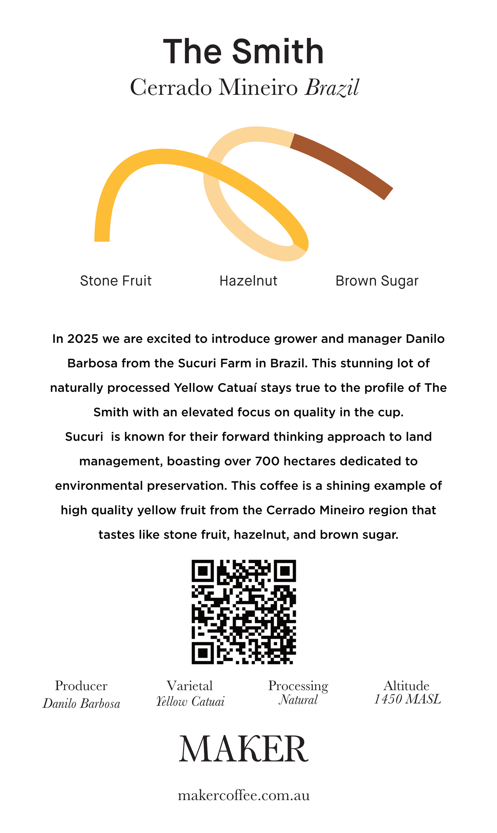 In 2025 we are excited to introduce grower and manager Danilo Barbosa from the Sucuri Farm in Brazil. This stunning lot of naturally processed Yellow Catuaí stays true to the profile of The Smith with an elevated focus on quality in the cup.